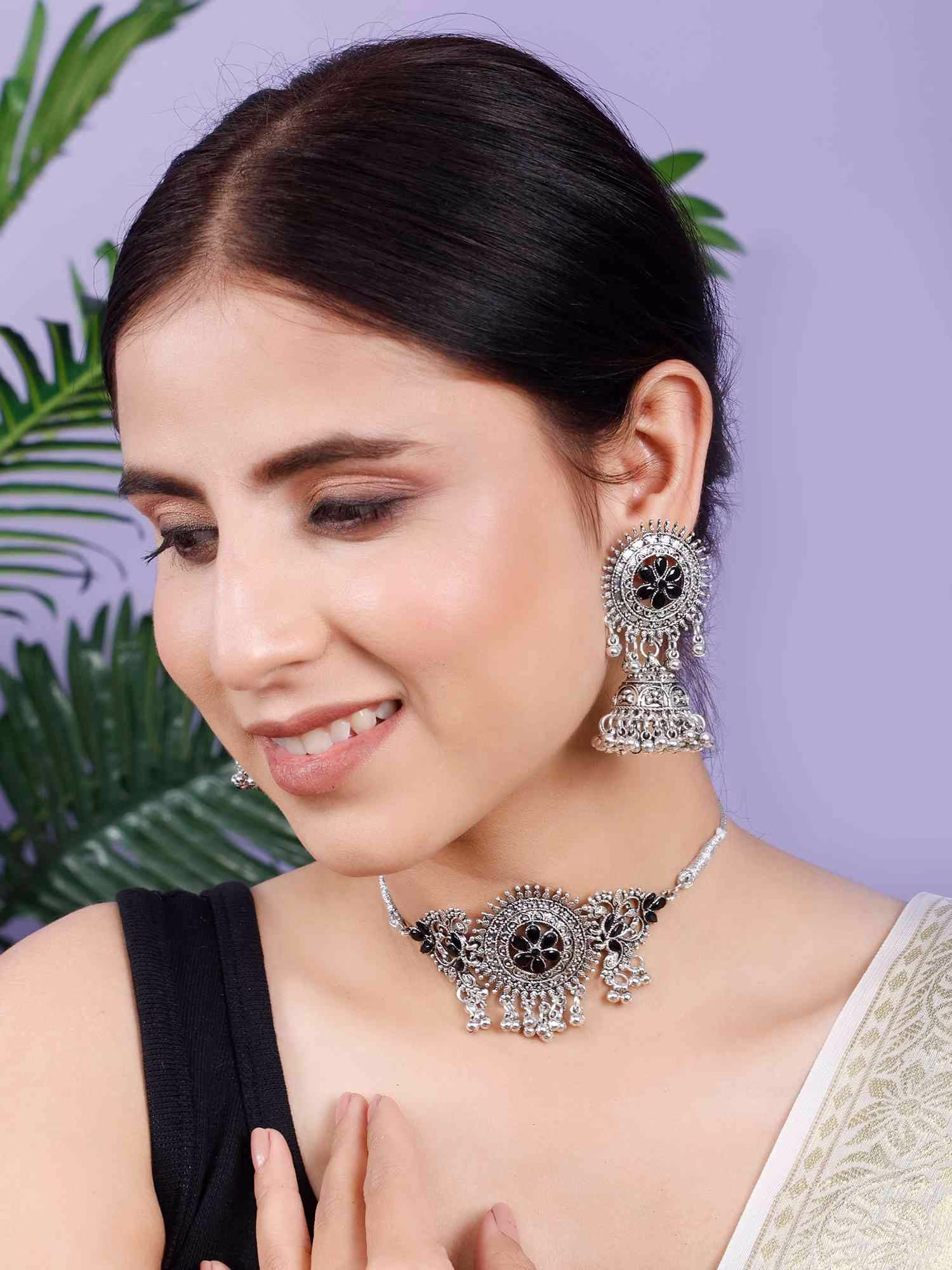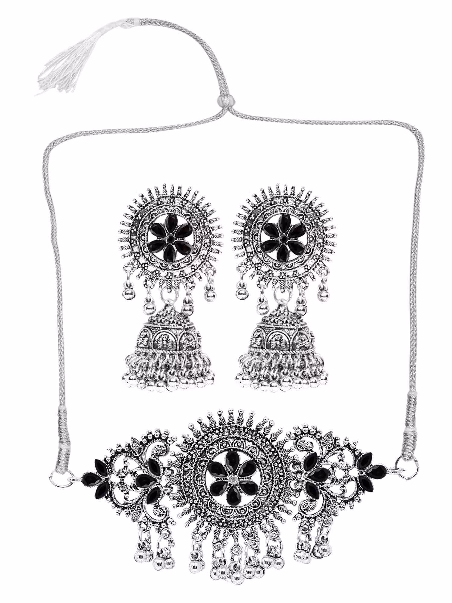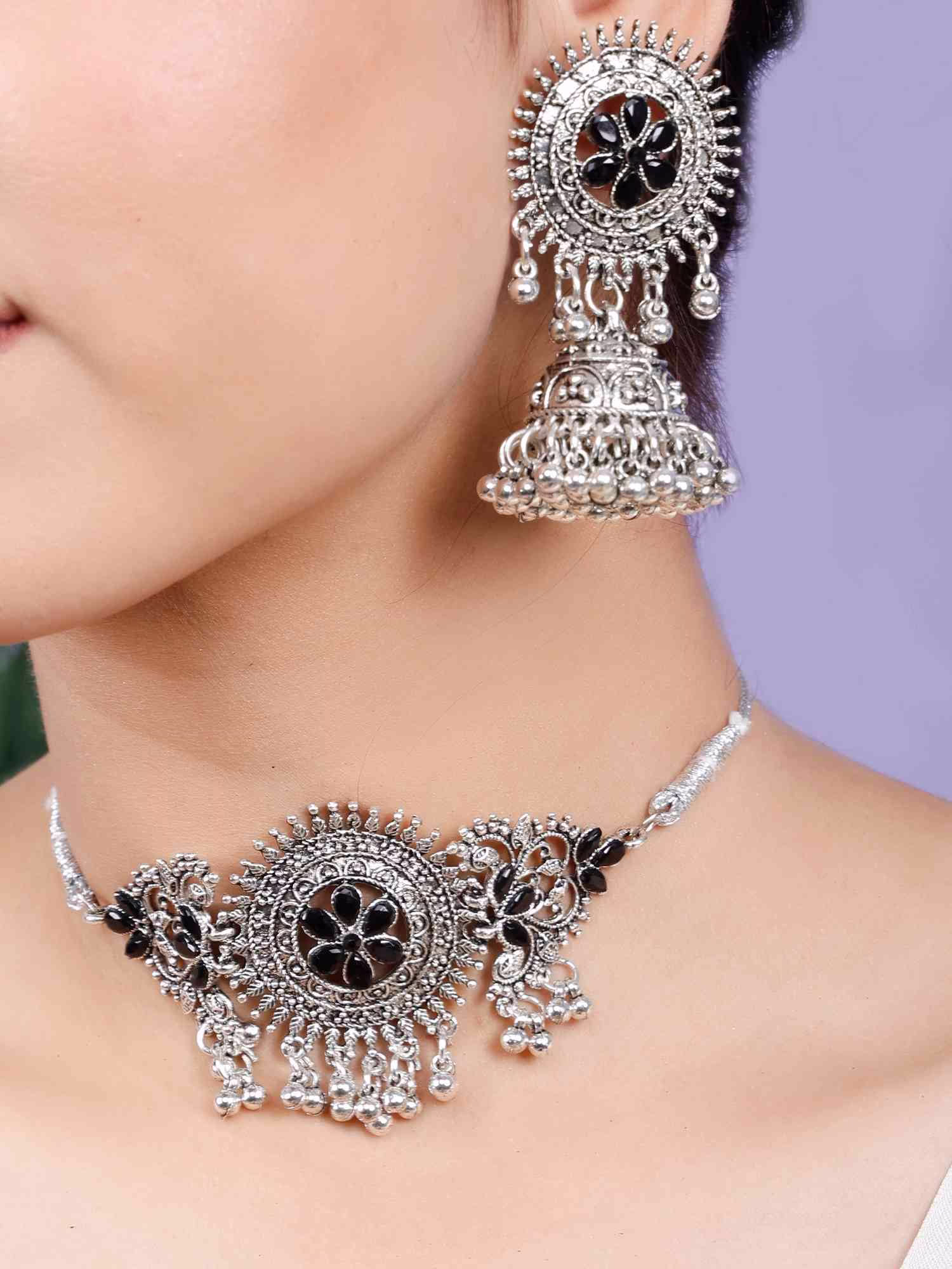 - Look no further! Our selection of stylish necklace designs has you covered, offering the ideal choker necklace set for women. Elevate your style by pairing this statement silver oxidized choker necklace with your favorite simple saree or lehenga.